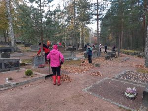 Kuusankosken Retkeilijät osallistuivat joukolla keskiviikkona 23.10. järjestettyihin haravointitalkoisiin Kuusankosken vanhalla hautausmaalla. Haravoijia oli kaikkiaan lähes 30 henkeä. Valtaosa talkoolaisista hajaantui jo ennen määräaikaa haravoimaan eri puolille hautausmaata, joten yhteiskuva jäi ottamatta. Sää oli erinomainen tähän tehtävään ja luonto oli vielä värikäs, kuten runsaat haravoitavat lehdetkin. Myös haravoijat näkyvät kuvissa värikkäinä pilkkuina  eri puolilla hautausmaata. Parin tunnin aktiivisen haravoinnin päätteeksi seurakunta tarjosi keittolounaan ja pullakahvit. Keitto oli maukasta, kuten yleensäkin, mistä kiitos emännälle.